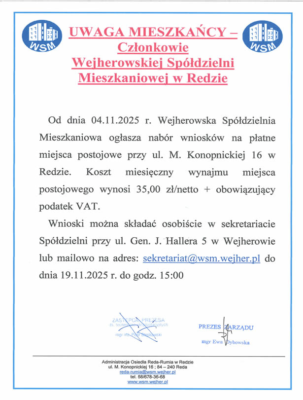 Biuro Zarządu Spółdzielni - techniczny@wsm.wejher.pl
